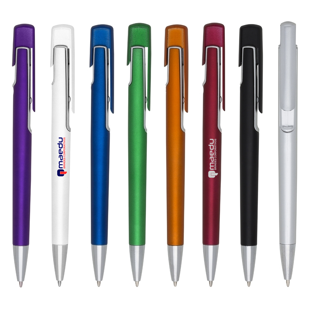Caneta plástica com carga esferográfica azul 1.0 mm e acionamento por clique.