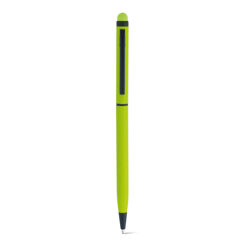 Esferográfica em alumínio com mecanismo twist, clipe de metal e ponteira touch. Escrita em azul até 1,5 km. ø8 x 137 mm