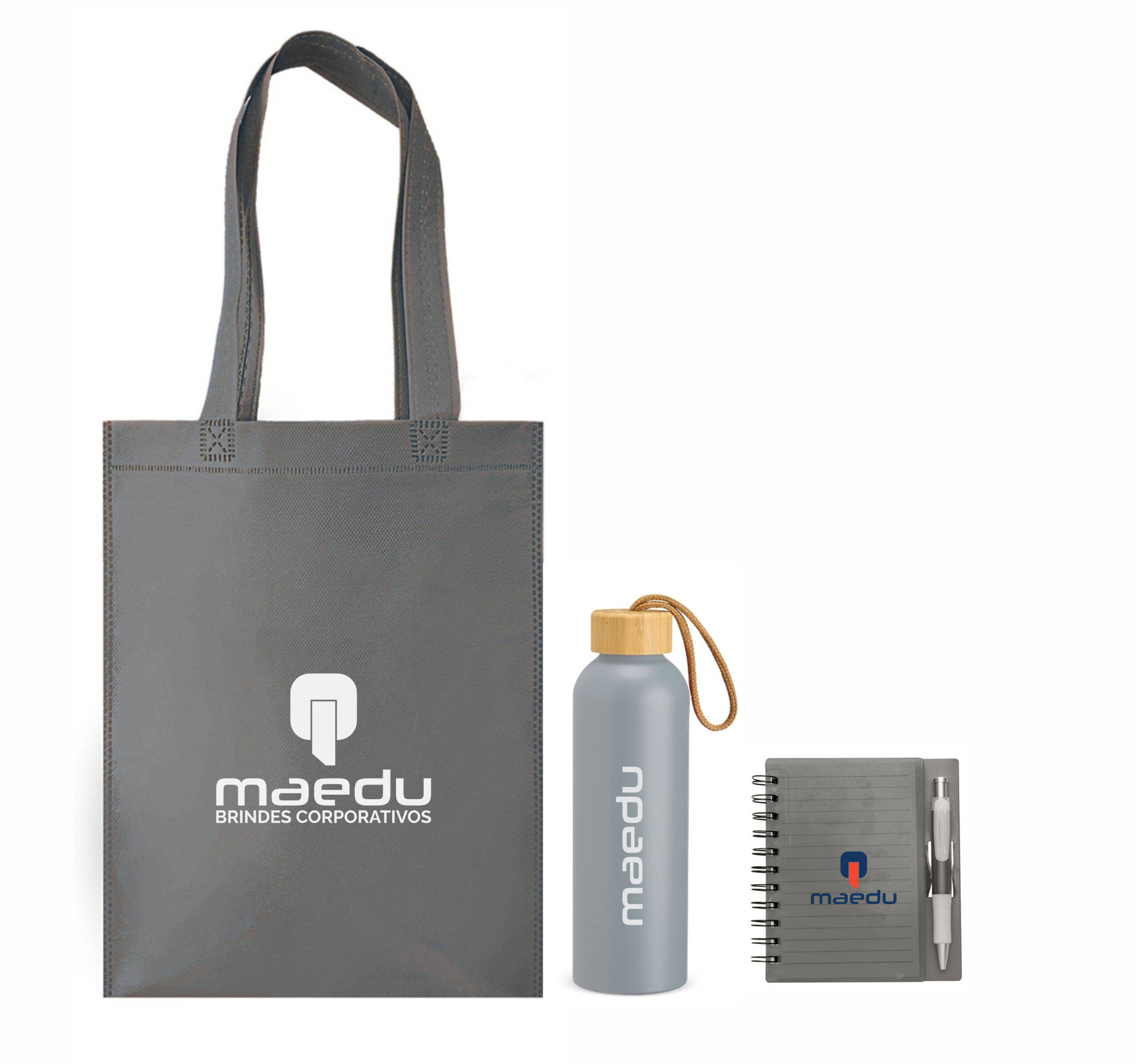 R$ 1,00SACOLA: Sacola de tnt com costura termo selada. GARRAFA: Garrafa de alumínio 630ml. Possui tampa plástica rosqueável com alça integrada. CADERNO: Caderno A5 plástico com wire-o […]