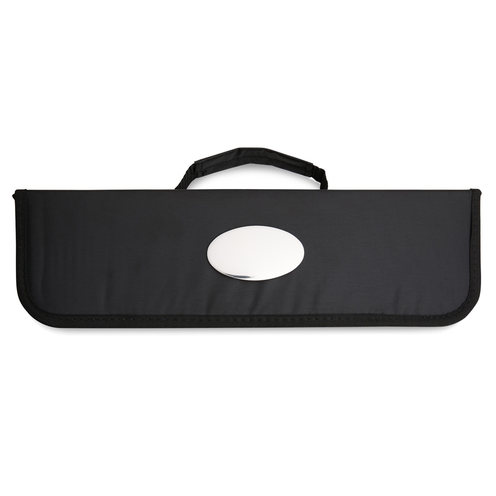 Praticidade para qualquer churrasco! Este kit conta com quatro peças essenciais: espátula, garfo, pegador e faca de 6 polegadas, todas em aço inox com cabos de madeira, acomodadas em um estojo de nylon que facilita o armazenamento e transporte. Para maior exclusividade, acompanha uma plaquinha metálica personalizável com verso autoadesivo.