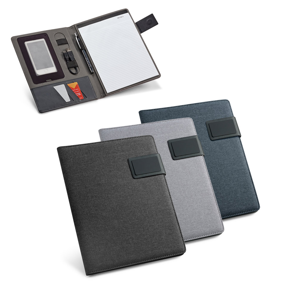 Pasta A5 em linho sintético e c. sintético com fecho magnético. O interior contém um bloco de 40 páginas pautadas, suporte para esferográfica (não inclusa) e outros compartimentos para acessórios (não inclusos). 183 x 252 x 18 mm | Placa: 50 x 30 mm